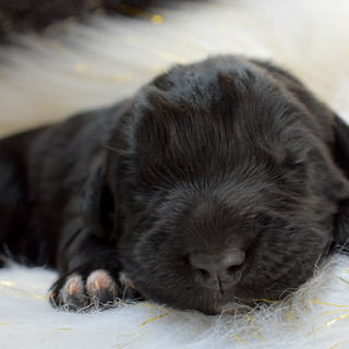 The newfies made it through their first week of life and are doing great. We are very excited about this litter and are eager to see how each grows and matures in the weeks to come. To see more pictures of each puppy click: Available Newfoundlands and click on a puppy you would like to look at. To watch individual videos of just how sleepy these little guys are click: Newfoundland Videos.